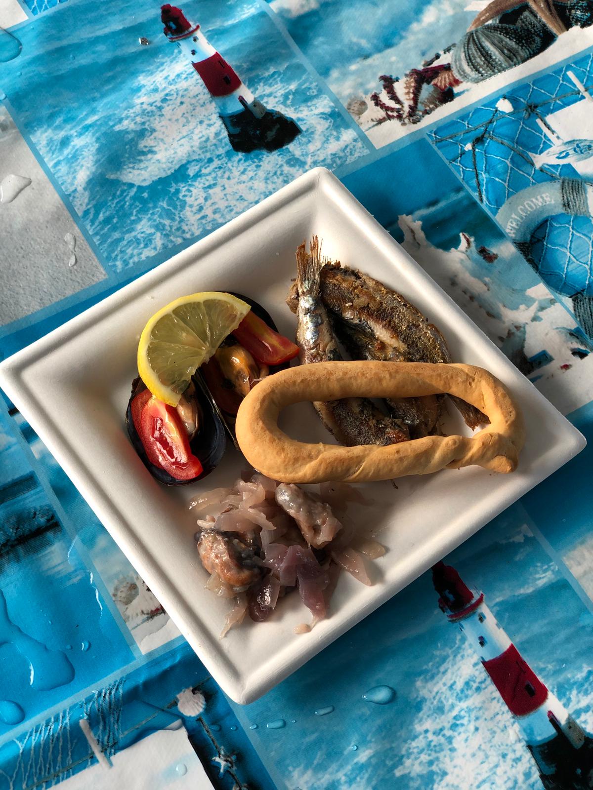 Dopo tutti questi profumini c'era salito l'appetito, quindi una volta a bordo Maria Vittoria ci ha servito un aperitivo incredibile con cozze fritte, sarde in saor e crostino con alici marinate. Così giusto per iniziare๐.