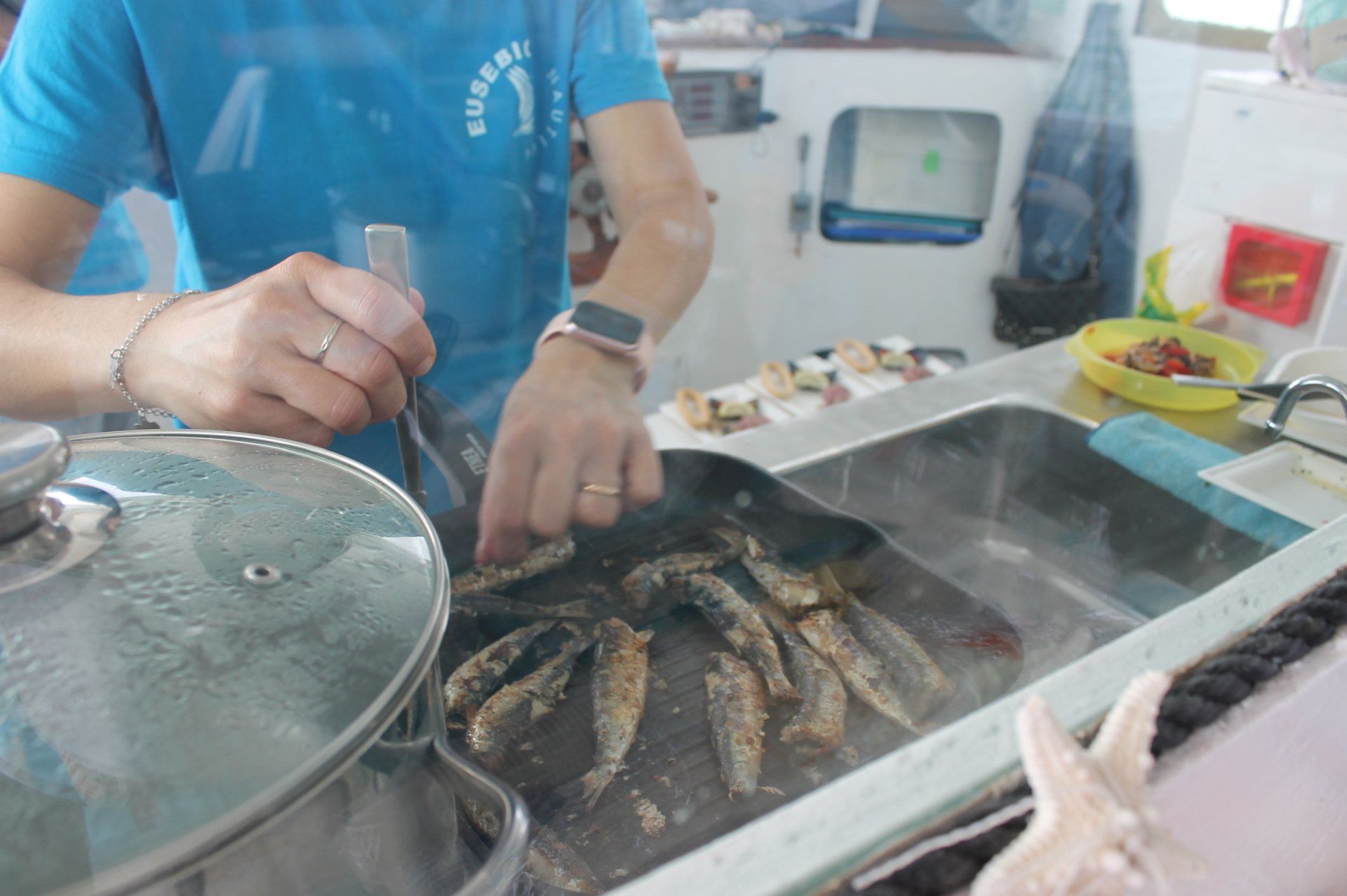 Dopo tutti questi profumini c'era salito l'appetito, quindi una volta a bordo Maria Vittoria ci ha servito un aperitivo incredibile con cozze fritte, sarde in saor e crostino con alici marinate. Così giusto per iniziare๐.